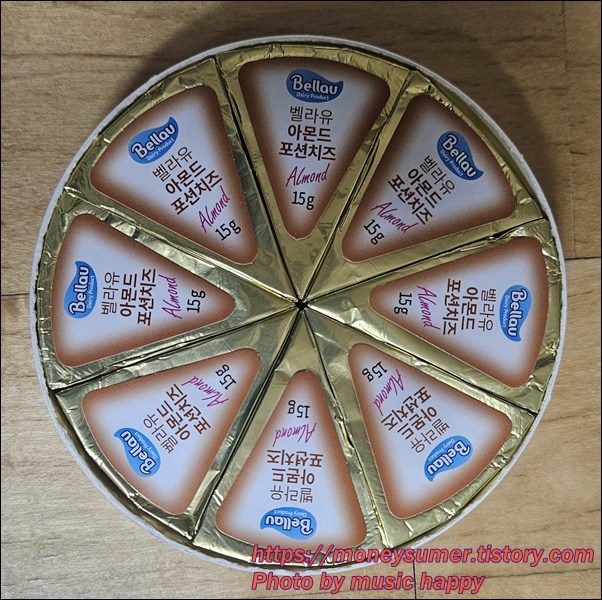 벨라유 아몬드 포션치즈는 아몬드가 첨가되어 있어서 잘게 잘라진 아몬드가 씹혀요