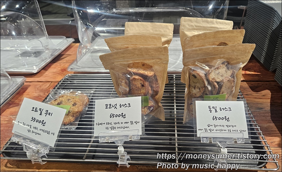 오트밀 쿠키 3,500원, 코코넛 러스크/ 통밀 러스크 6,500원 그리고 소금빵뿐이었어요.