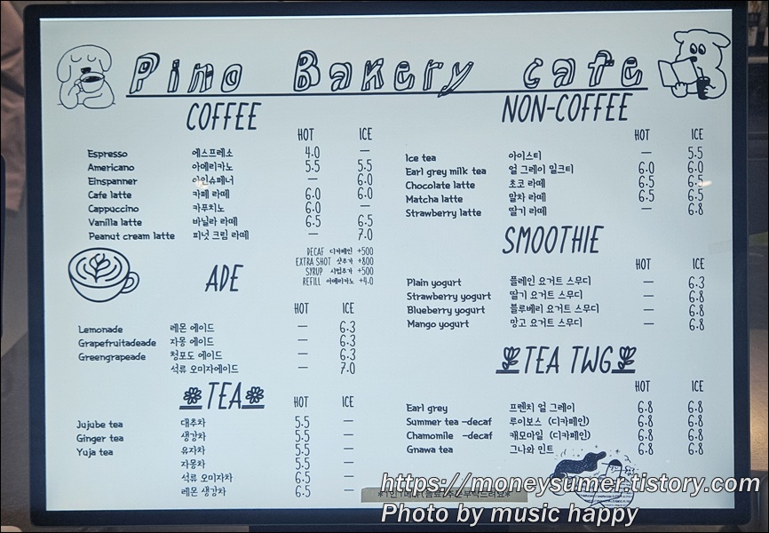 - 커피 : 에스프레소 4.0, 아메리카노 5.5, 카페라떼/ 카푸치노 6.0, 바닐라라떼 6.5