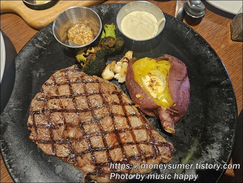 스테이크가 부드럽고 적당히 간이 되어 있어서 소금을 찍지 않아도 맛있어요.