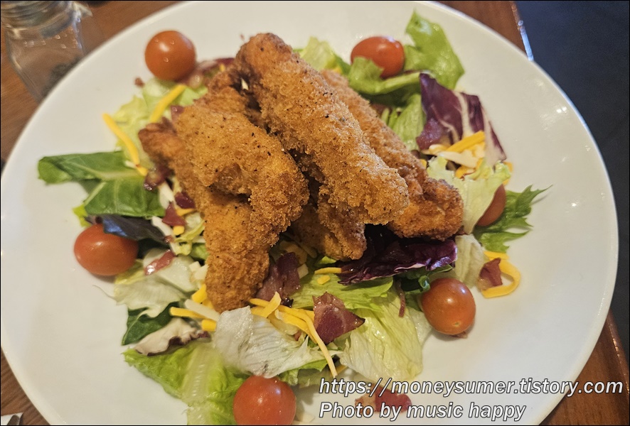 치킨텐더가 바삭바삭하니 맛있고 신선한 샐러드와 함께 먹으니 질리지 않고 맛있게 먹을 수 있어요