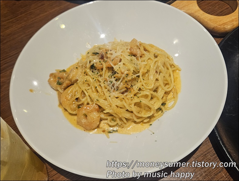 원래 이 파스타는 두꺼운 면으로 나오는데 저희는 얇은 면으로 바꿔 달라고 했어요