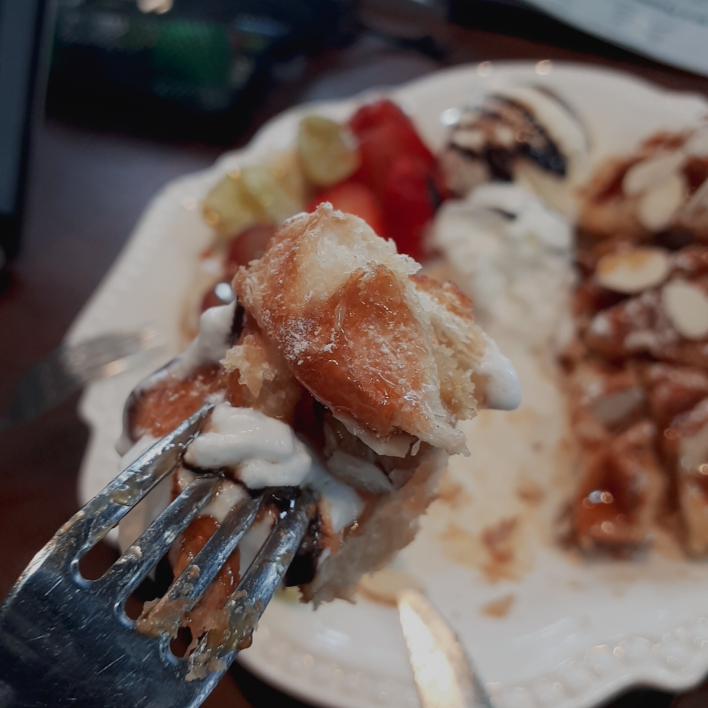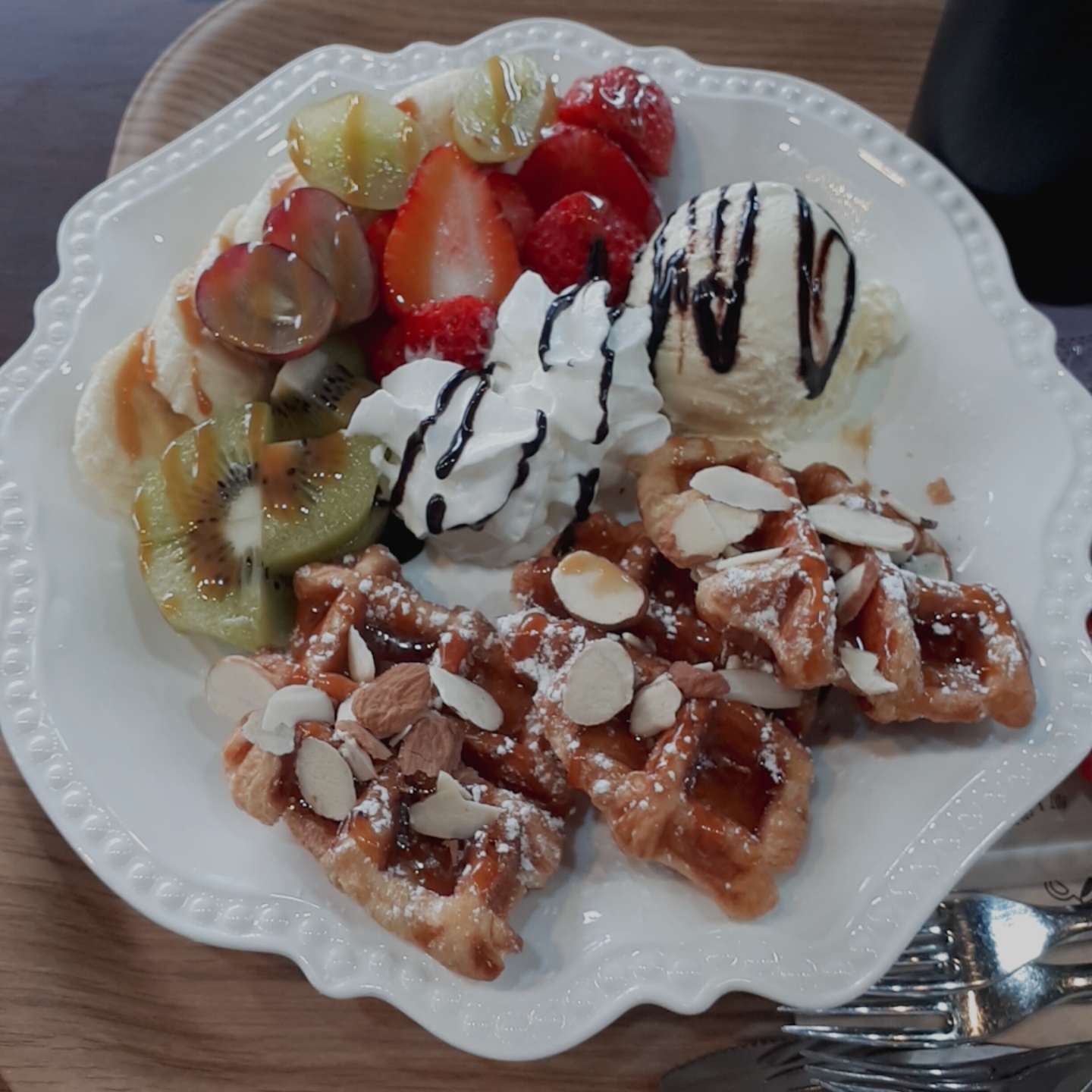 와플은 겉은 바삭 속은 촉촉한 맛이고 아몬드가 뿌려져서 고소한 맛까지... 거기다 아이스크림까지 찍어서 먹으면 정말 너~무 맛있어요~😀 이 와플은 올 때마다 거의 빠지지 않고 주문해서 먹는답니다.