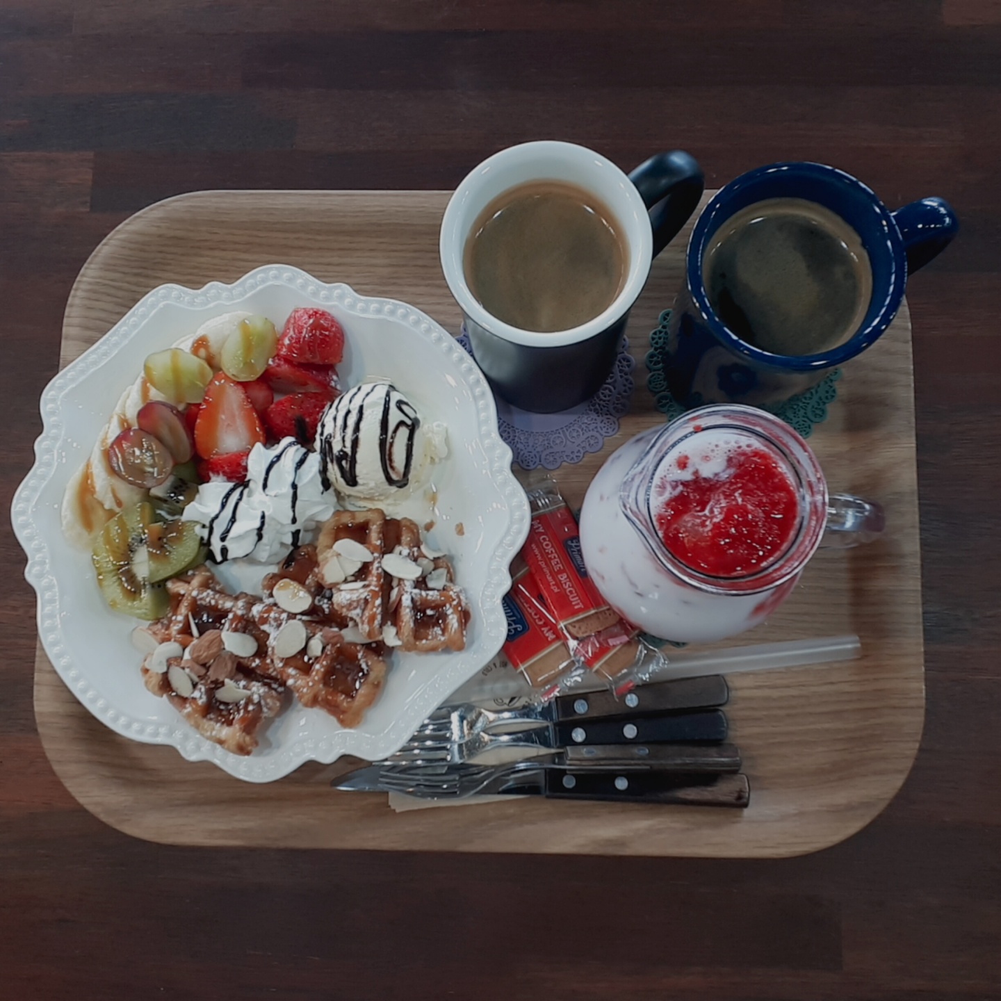 주문한 음료와 와플이 나왔어요. 쿠키는 서비스로 주신 거예요~
