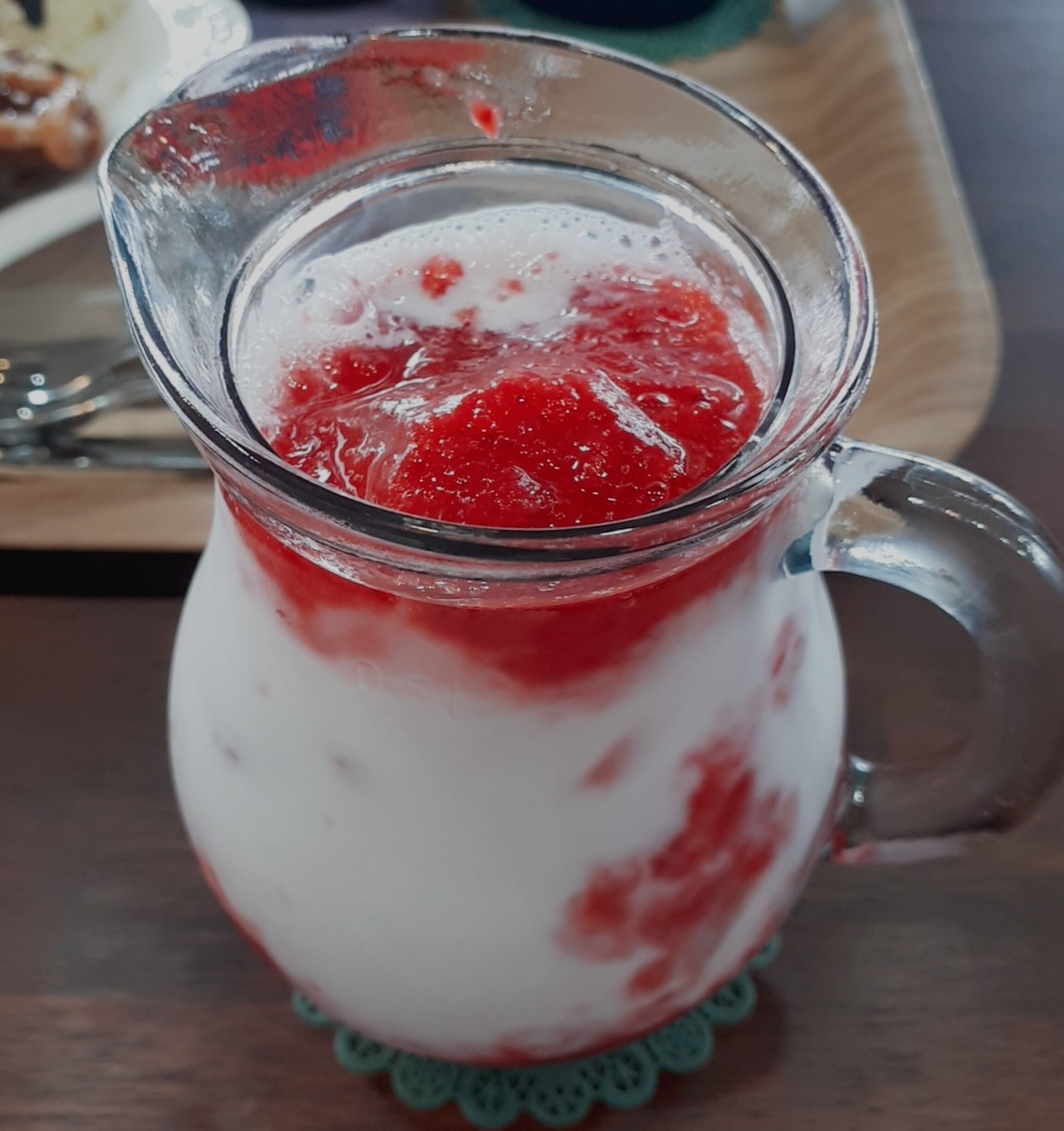 딸아이가 주문한 딸기라떼에요. 저도 조금 먹어봤는데, 역시 시원하고 달달한 게 맛있더라고요. 더 먹고 싶었으나 딸이 먹을 음료를 제가 많이 마셔버리면 안 될 것 같아 참았답니다~(•_•)