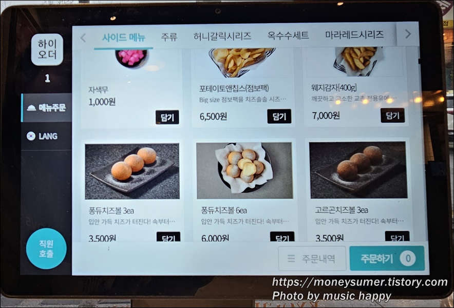 - 포테이토 앤 칩스 6,500원, 웨지감자 7,000원, 퐁듀치즈볼 6ea 6,000원, 고르곤치즈볼 3ea 3,500원