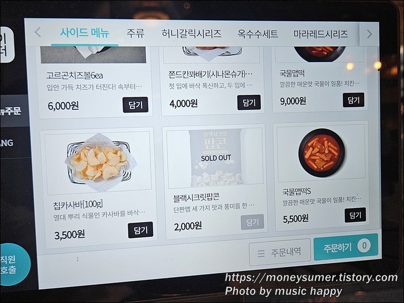 - 사이드 메뉴 : 고르곤치즈볼(6ea), 6,000원, 쫀드칸꽈배기 4,000원, 국물맵떡 9,000원, 칩카사바 3,500원
