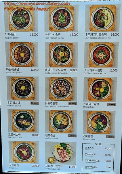 - 스테이크솥밥/ 연어솥밥 18,000원, 전복솥밥 16,000원, 장어솥밥 20,000원, 우삼겹스키야키 17,000원
