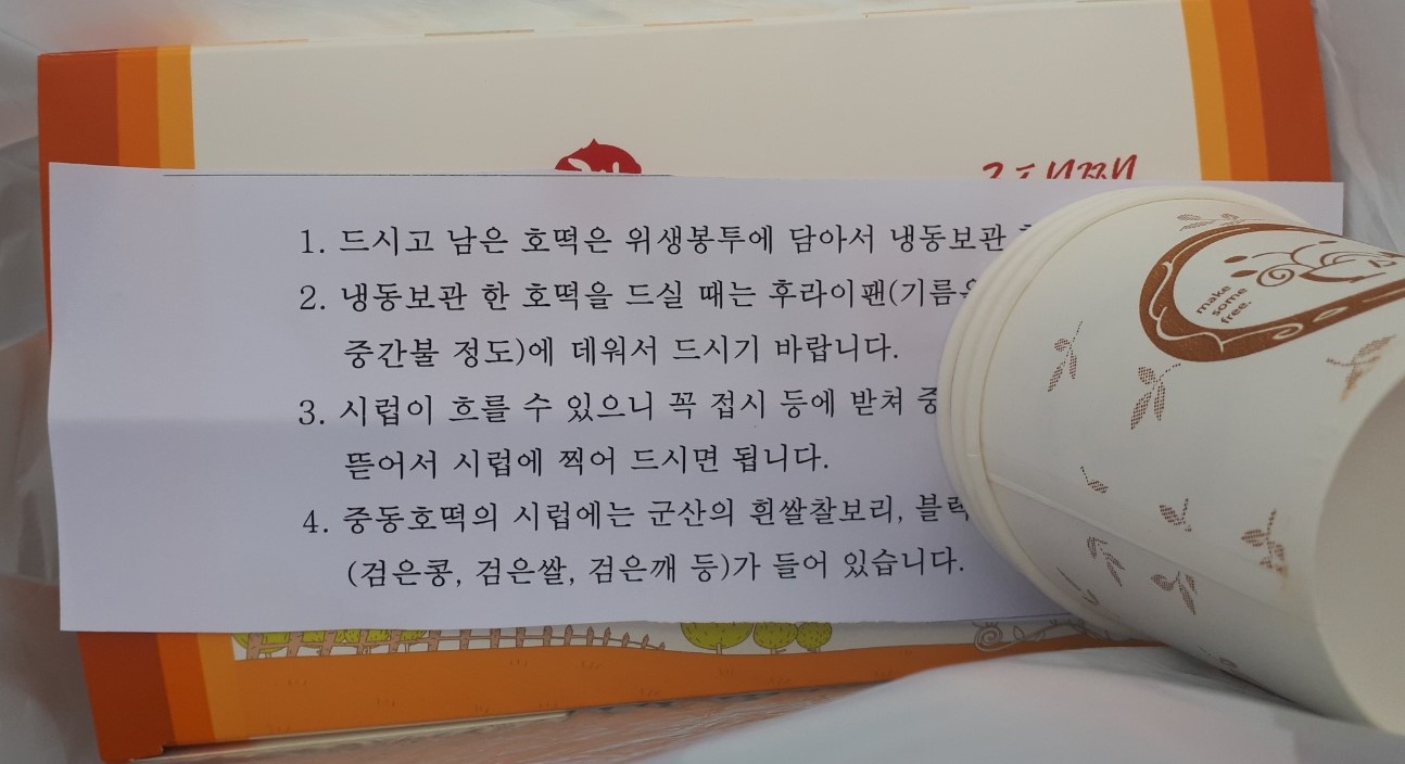 드디어 포장된 호떡이 나왔어요. 6개 주문을 했는데 한 번에 담아주시는 게 아니라 3개씩 담아 주시네요. 설명서와 종이컵도 함께요~