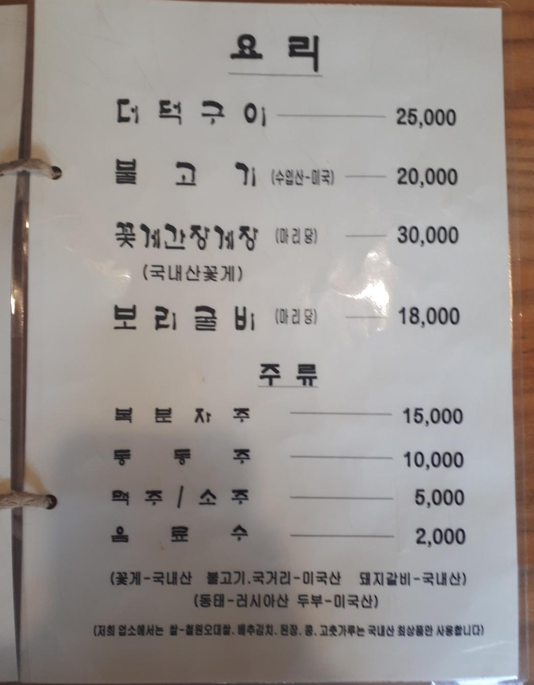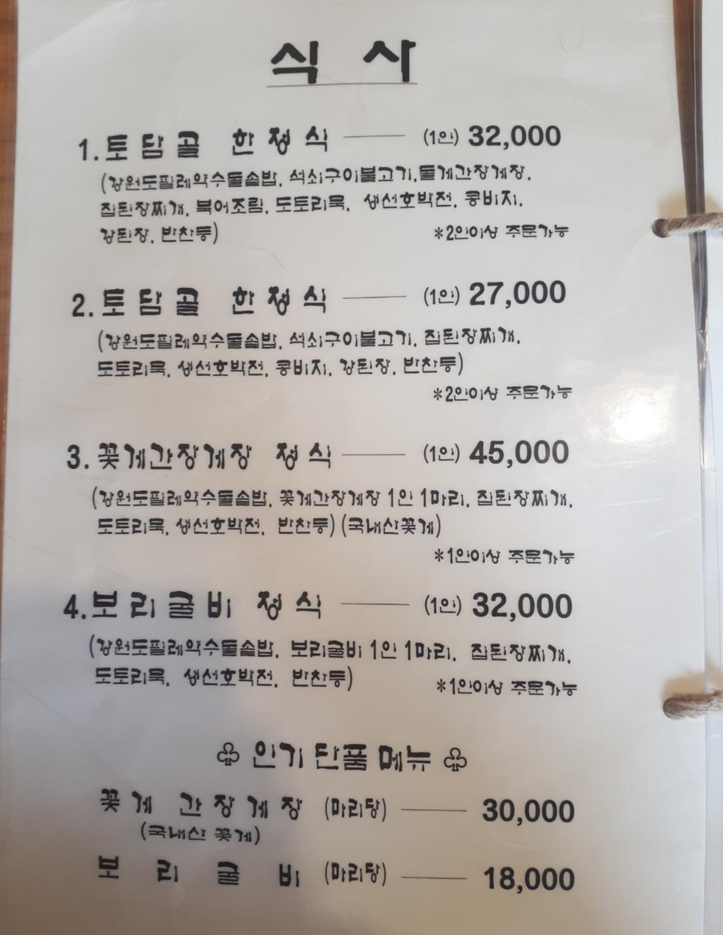 예상은 했지만 역시 한정식은 가격이 세네요~ 저희는 그나마 가장 저렴한 2번 토담골 한정식 2인분을 주문했어요~
