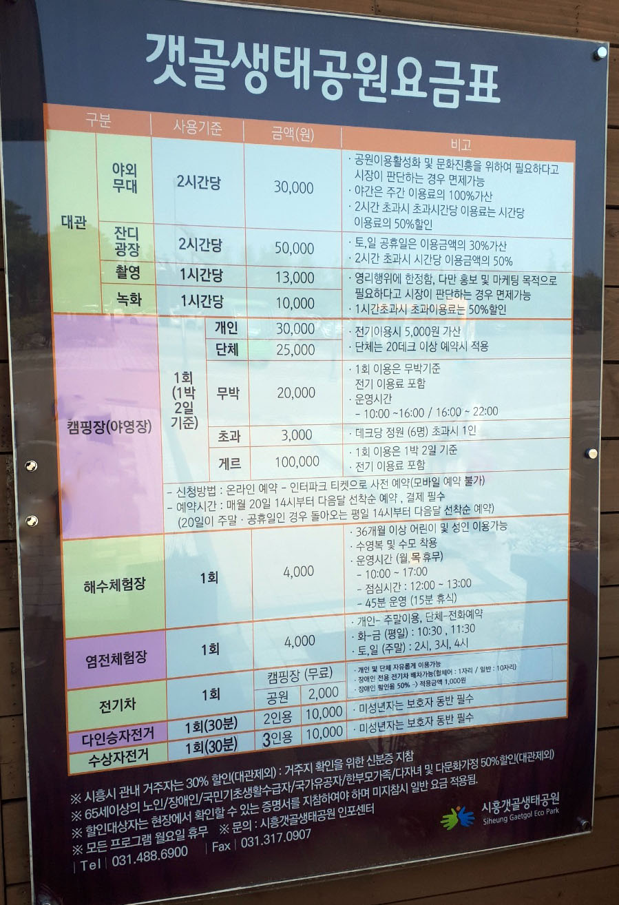 갯골생태공원 인포센터 문앞에 갯골생태공원 요금표와 전기차 운행시간표가 있더라고요~