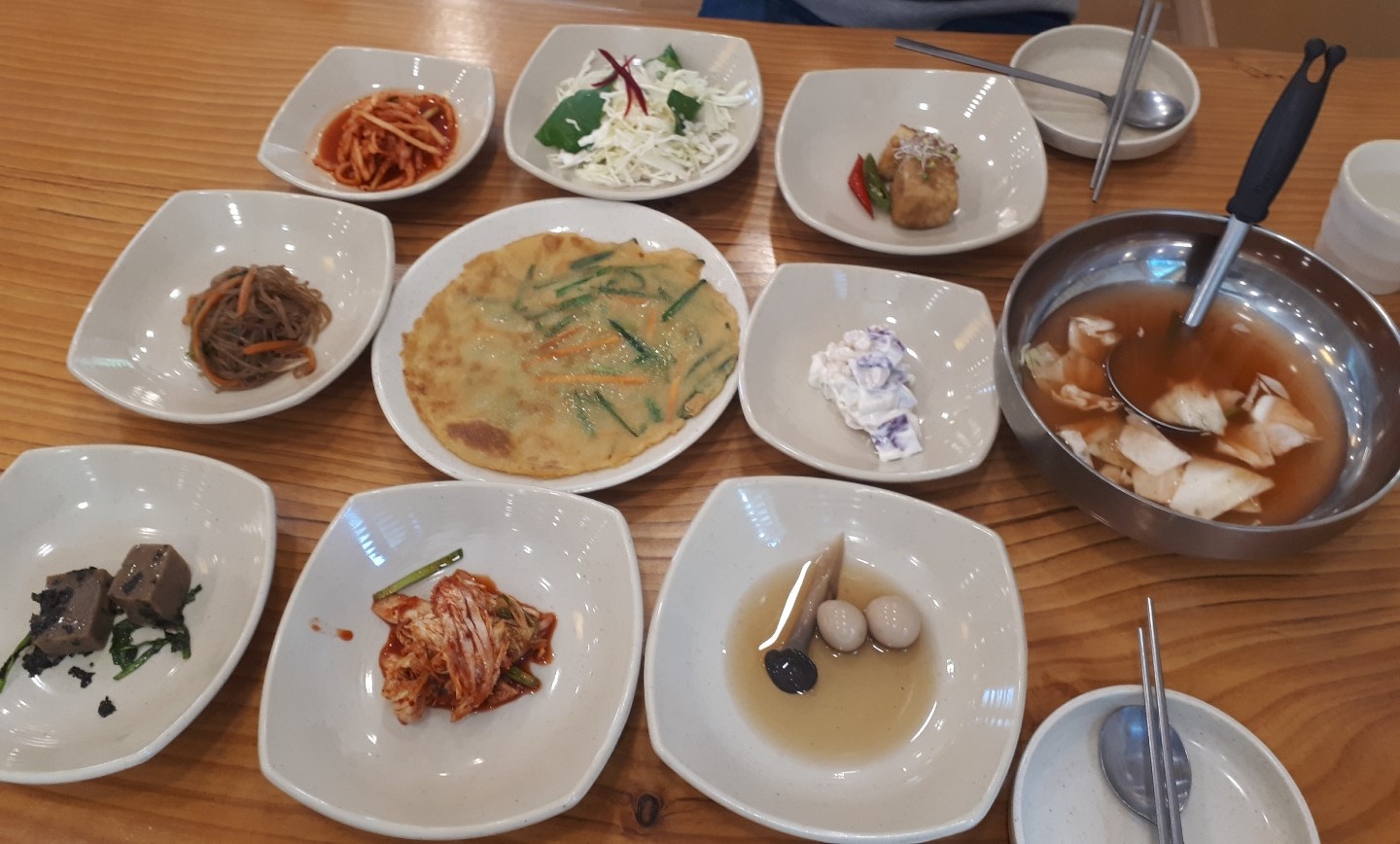 밑반찬이 나왔어요. 잡채와 전, 김치, 묵, 두부튀김 등 반찬들이 맛있더라고요~