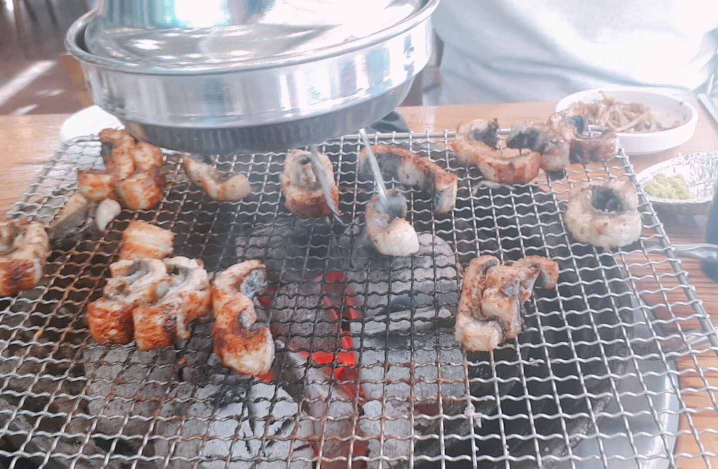 음식점 바로 옆인 아산 수산에서 구입해 온 장어를 숯불에 올리고 굽기 시작했어요. 고기는 수시로 구워봤지만 장어 굽는 건 익숙지 않아서 어설프게 하고 있었더니 직원분이 오셔서 구워주시네요~