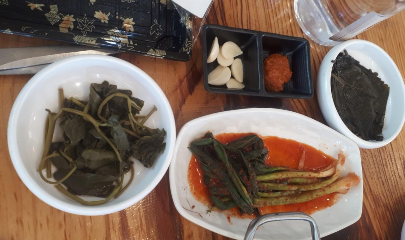 깻잎장아찌와 파김치, 나물, 그리고 쌈장과 마늘이 밑반찬으로 나왔어요~