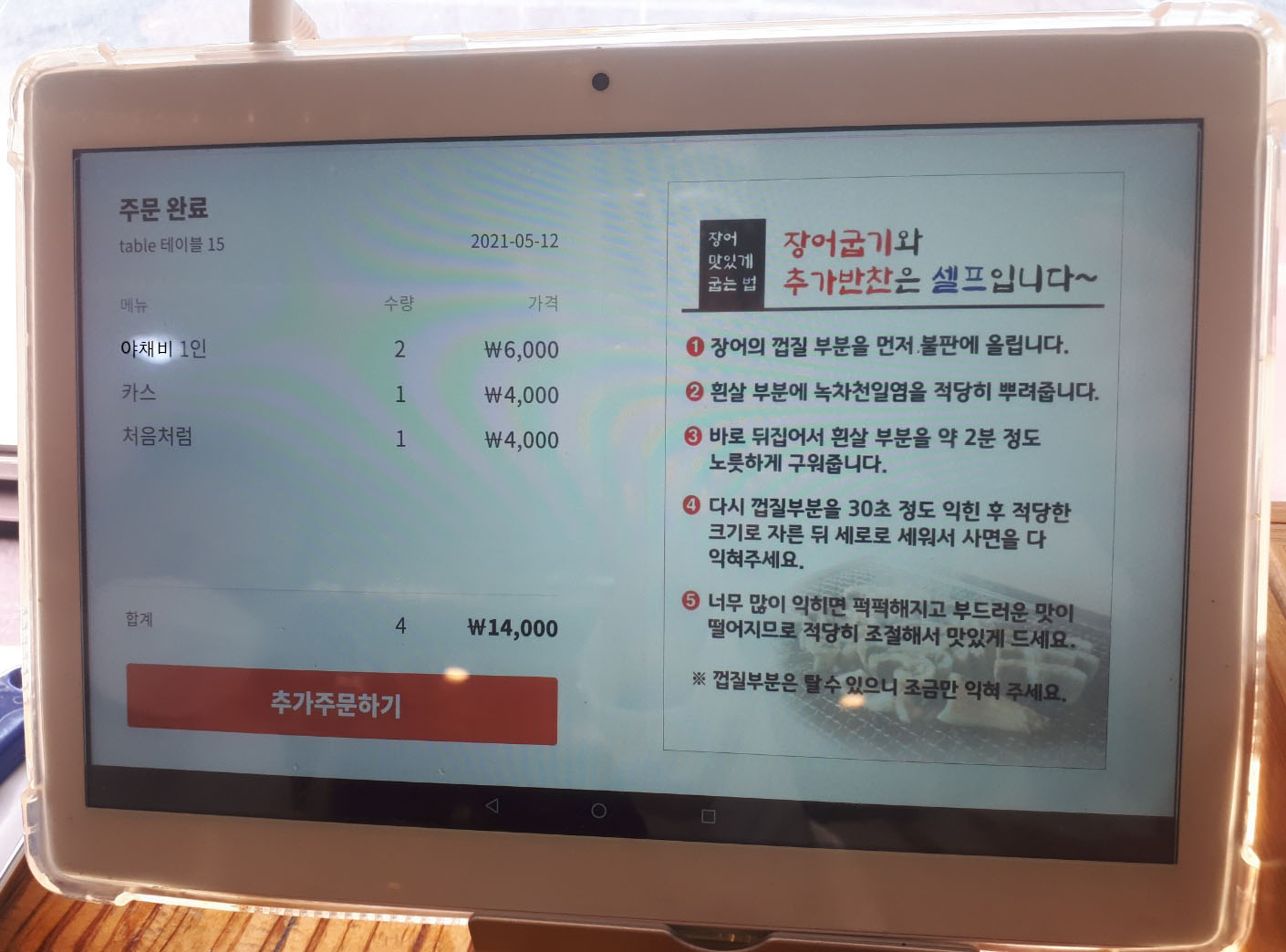 장어 외에 주문할 사항은 각 테이블마다 놓여있는 전자메뉴판에서 추가 주문을 하셔야 해요~