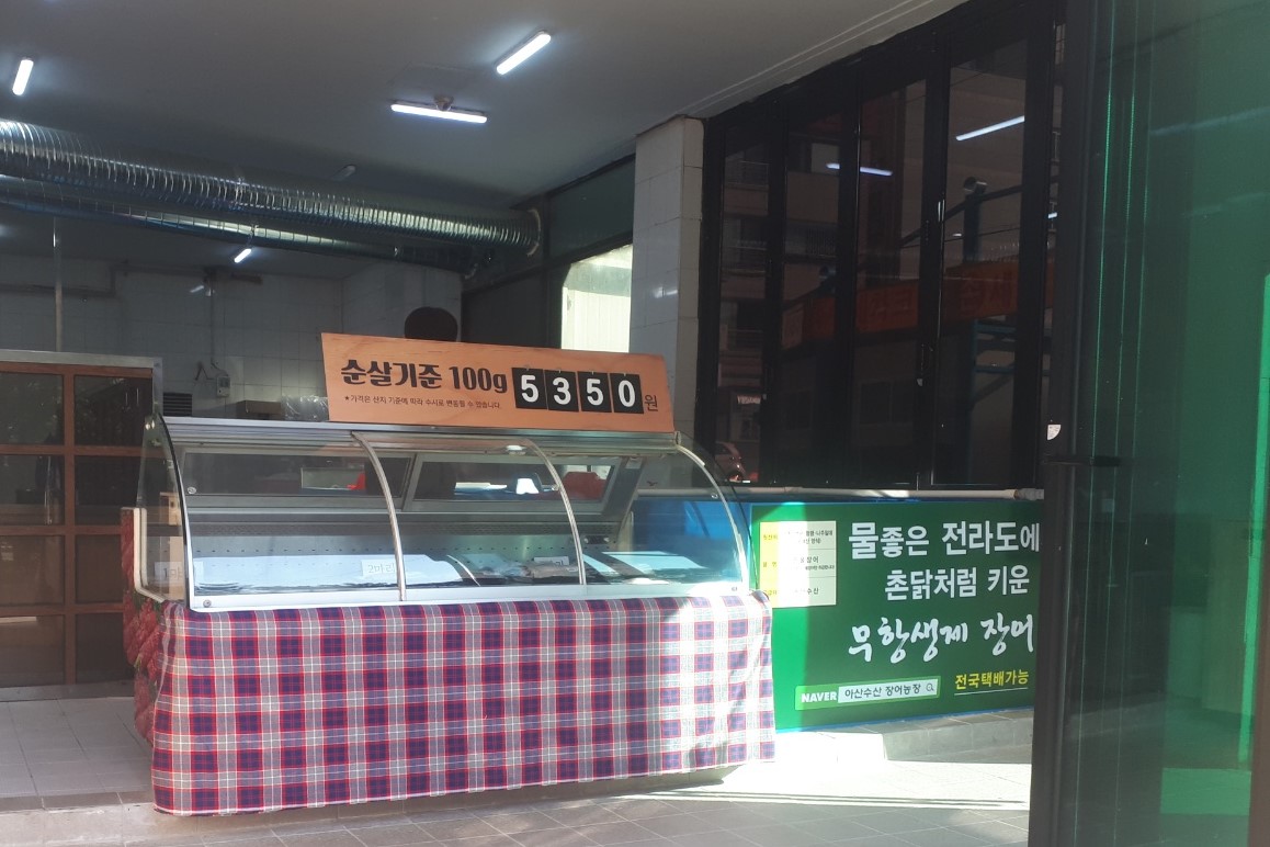 그래서 먼저 아산 수산 집으로 갔어요. 물 좋은 전라도에서 촌닭처럼 키운 무항생제 장어라는 문구가 눈에 띄네요~