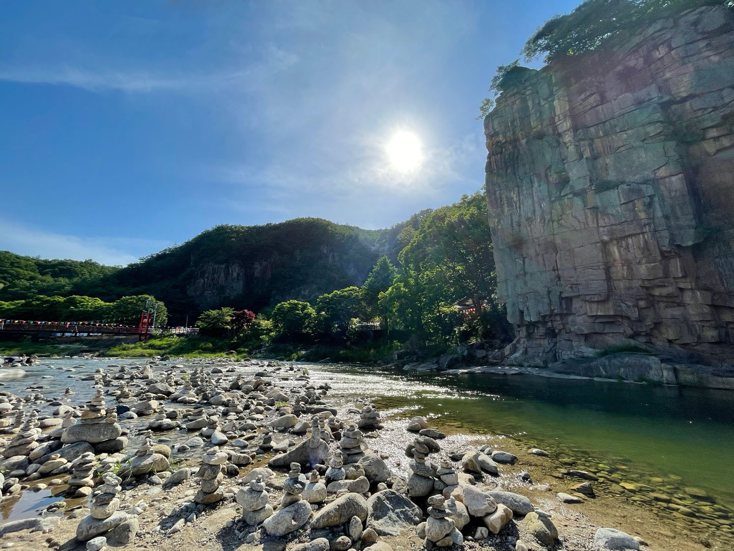 50m의 높이인 사인암 경치가 너무 아름다워요!~ 사인암의 기암절벽이 마치 일부러 깎아놓은 듯한 모습을 하고 있네요. 이런 정경은 자연이 주는 선물 같아요~😊 많은 사람들이 소원을 빌며 돌탑도 쌓아 놓았나 봐요~ 사인암과 돌탑이 어우러져서 더욱더 멋있게 보이네요~