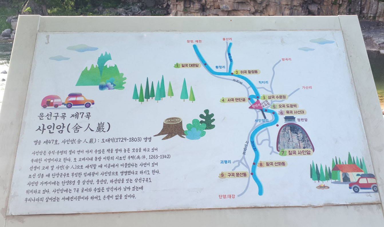 사인암(舍人巖)은 명승 제47호로서 수직·수평의 절리 면이 마치 수많은 책을 쌓아놓은 모습을 하고 있어 유래한 지명이라고 합니다. 또 고려시대 동방 이학의 시조인 우탁선생이 고려말 사인으로 재직할 때 이곳에서 머물렀다는 사연이 있어 조선 성종 때 단양군수로 부임한 임재광이 사인암으로 명명했다고 하기도 한답니다.