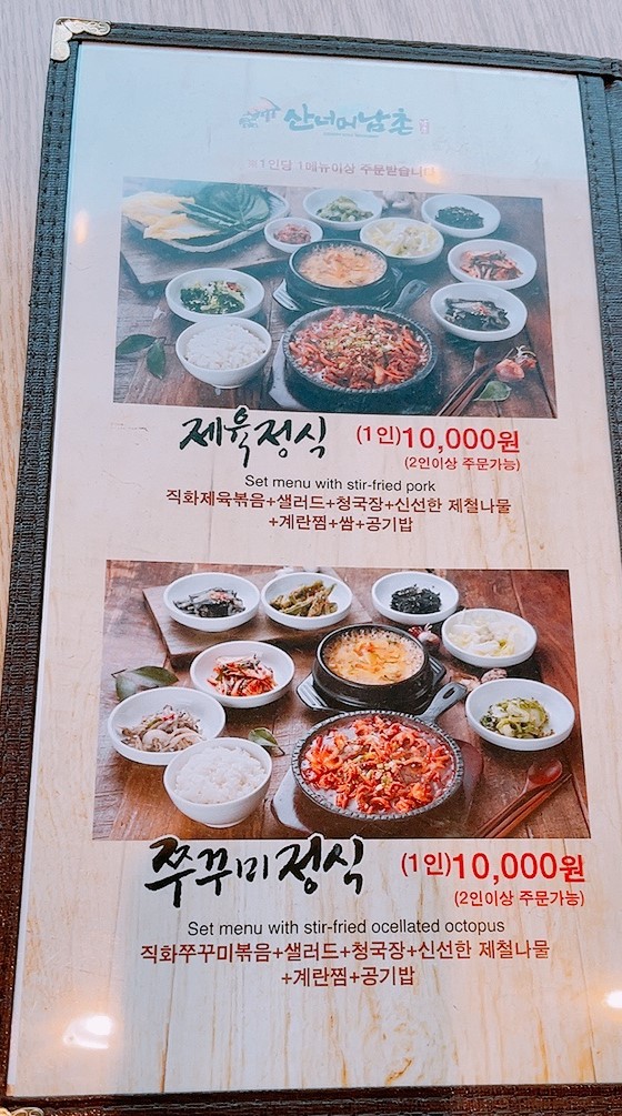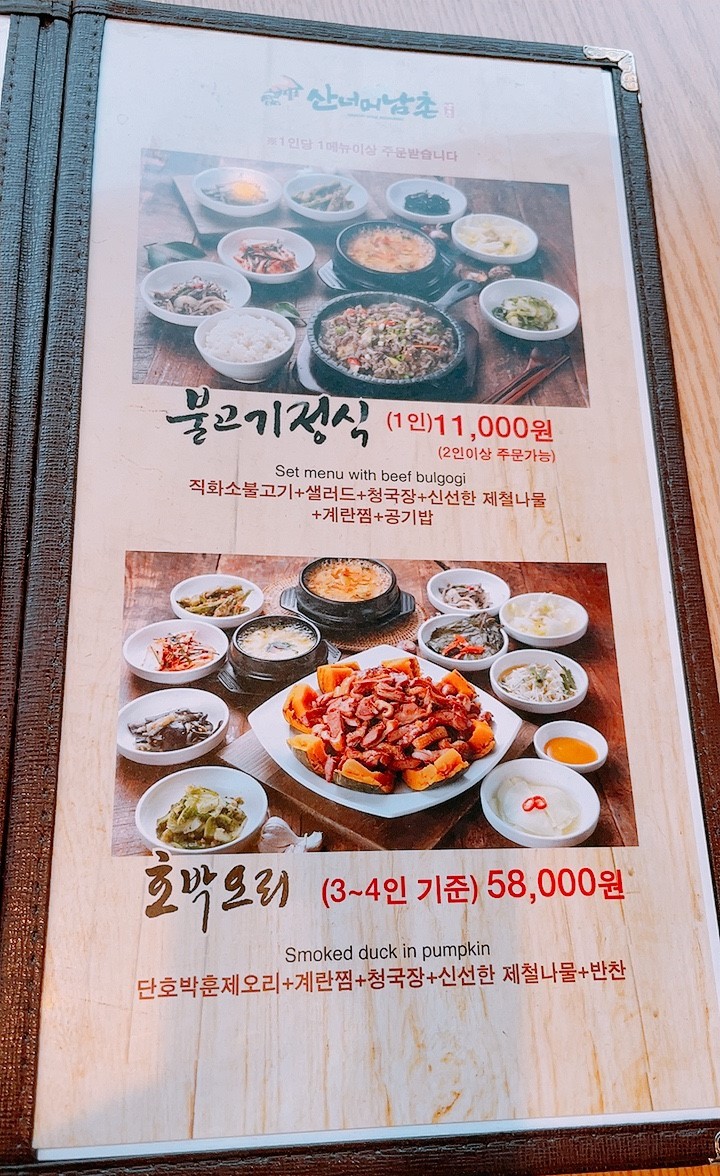 제육 정식, 주꾸미 정식, 불고기 정식, 호박 오리까지 다 맛있게 보여요~ 전에 왔을 때는 인원이 많아서 호박 오리를 먹었었는데 꽤 맛있었던 기억이 있어요~