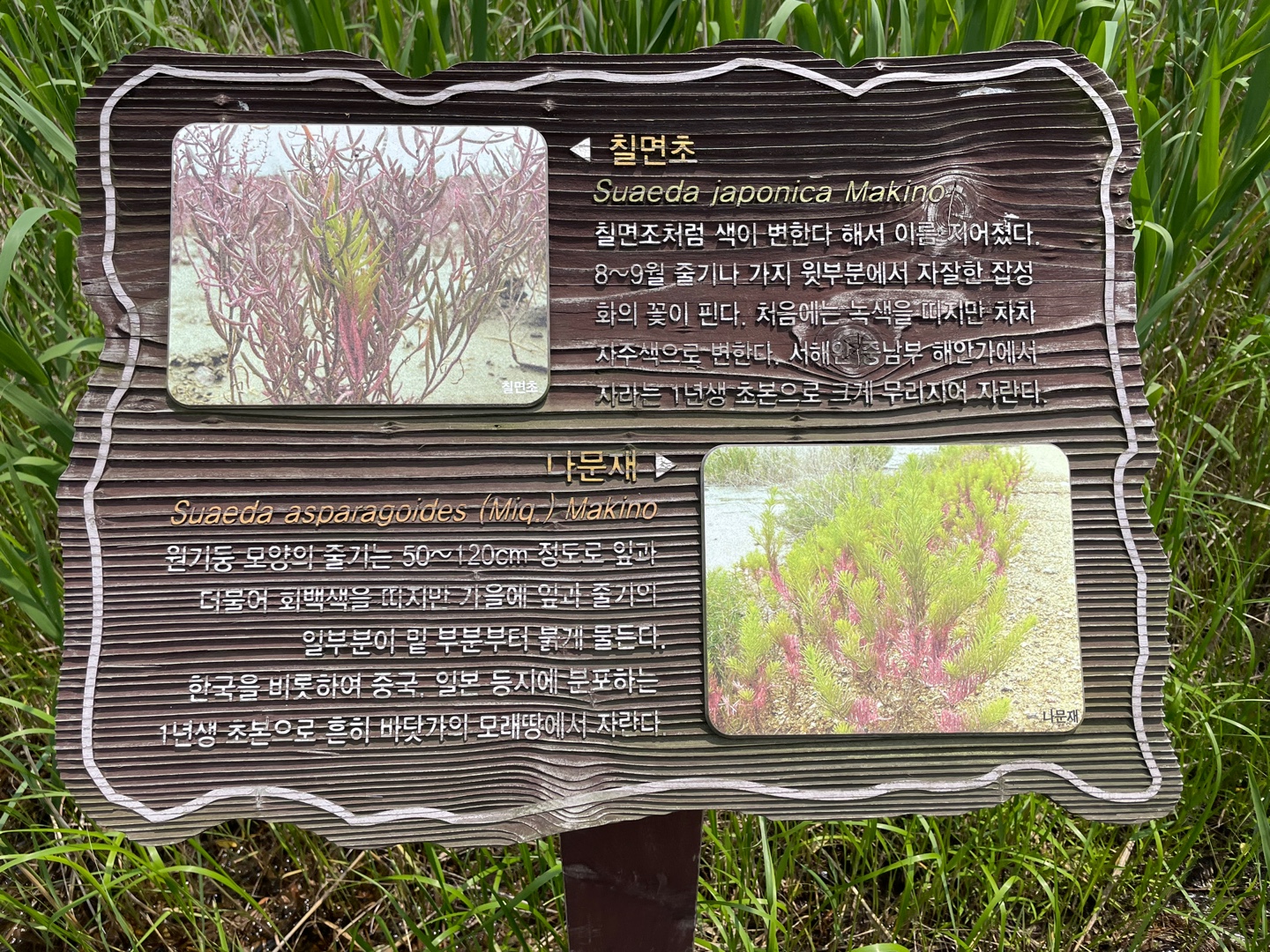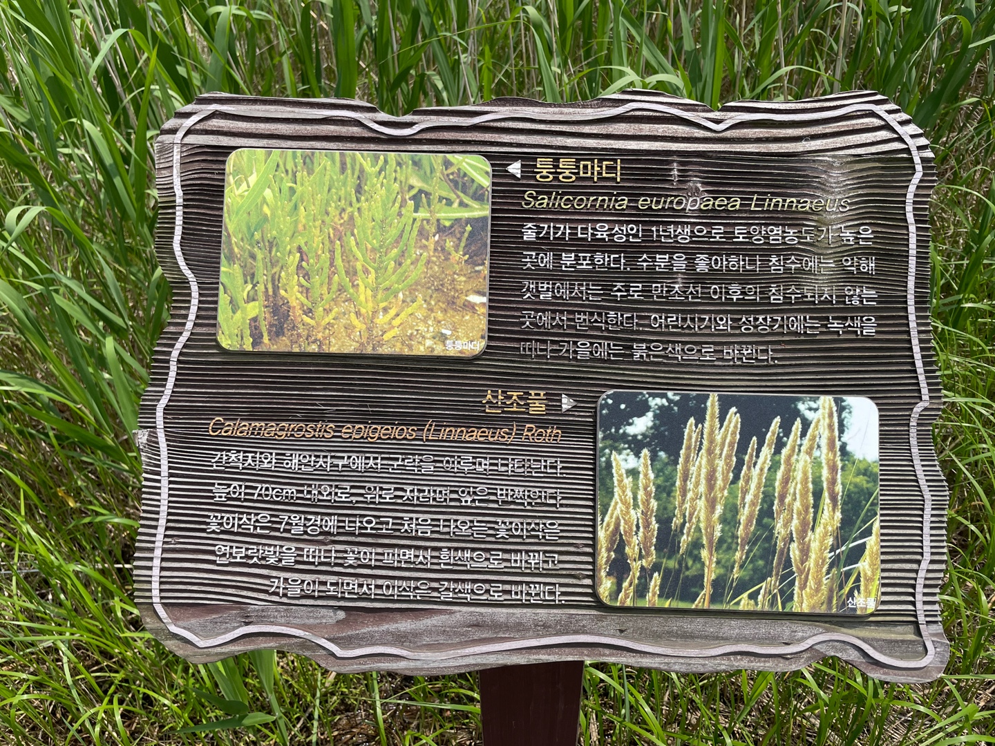 갈대랑 길에서 볼 수 있는 갈대의 종류로는 칠면조처럼 색이 변한다 해서 이름 지어진 칠면조, 원기둥 모양의 줄기와 잎이 회백색을 띠지만 가을에 잎과 줄기의 일부분이 밑 부분부터 붉게 물드는 나문재, 줄기가 다육 성인 1년생 퉁퉁마디 그리고 간척지와 해안지구에 군락을 이루며 나타나는 산조풀도 있답니다~