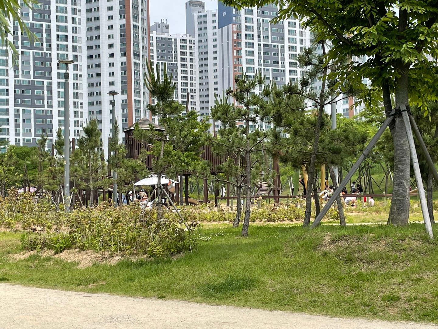 나무에 가려져서 잘 보이진 않지만 놀이터도 있어요. 굉장히 많은 아이들이 놀고 있더라고요~