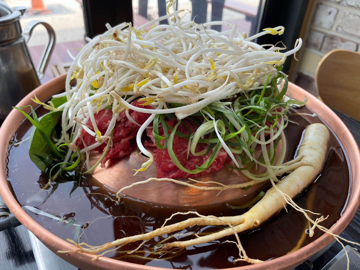 불고기와 큼지막한 인삼 그리고 숙주나물, 파채를 올려 주시네요~